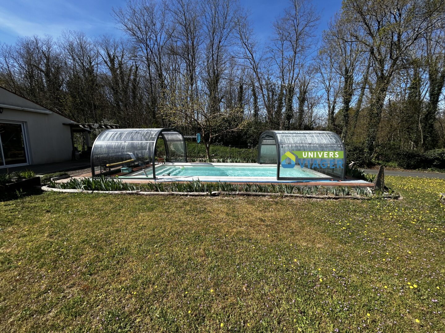 La piscine de 7 x 3 m est chauffée et traitée au sel. Le dôme qui la couvre est amovible et permet de la sécuriser.